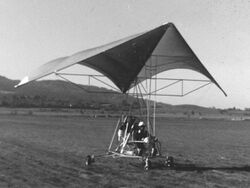 In 1961, Engineer Thomas Purcell built a towable Rogallo-wing glider with an aluminum frame, wheels, a seat and basic control rods; soon he replaced the wheels for floats and motorized the aircraft.[26] In 1964, Swiss inventor Pierre Aubert saw a photo of NASA's Fleep and completed construction of a similar trike. As with the Fleep, his Rogallo wing was fixed and did not allow for pendulum weight-shift control.[27]