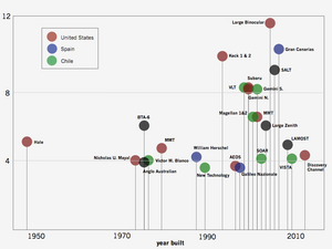 | Nicholas U. Mayall 4 m[11] | 4 m (157 in) | Single | United States | Kitt Peak National Obs., Arizona, USA | 1973 | ||