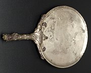 Bronze mirrors preceded the glass mirrors of today. This type of mirror, sometimes termed a copper mirror, has been found by archaeologists among elite assemblages from various cultures, from Etruscan Italy to Japan . Typically they are round and rather small, in the West with a handle, in East Asia with a knob to hold at the back, often with a loop for a cord, or silk tassel.[1] Some were fitted with small stands, and others had a hinged protective cover.[2] In surviving ancient examples the surface is too corroded to be reflective, but some bronze mirrors are still made.