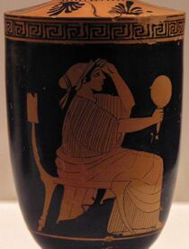 The Bronze Age Minoan civilization produced hand-mirrors in the 2nd millennium BCE, followed by the Myceneans. They were no doubt following the Egyptian or Near Eastern precedents. After disappearing in the Greek Dark Ages, they returned in Archaic Greece, including some mirrors on elaborate stands (already an Egyptian type), as well as hand-mirrors with handles. The stands most often featured a standing female figure, often with putti. These are called "caryatid mirrors".