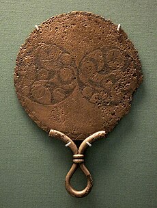 Celtic mirrors in Britain were produced up until the Roman conquest.[19] Two notable examples include the Birdlip and Langton Herring mirrors.[20]