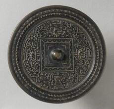 Bronze mirrors were produced in China from Neolithic times until Western glass mirrors were brought to China. Bronze mirrors were usually circular, with one side polished bright, to give a reflection, and the reverse side normally decorated in cast relief in early examples, later on sometimes inlaid in precious metal. They generally had a knob or loop in the center of the back so that they could be easily held in the hand, and sometimes attached to clothing. In the Tang and Song dynasties some examples were larger and more variable in shape. Other examples are so small, about 5 cm across, that they may have been mainly intended for ritual use, as "charms to ward off evil spirits".[13]