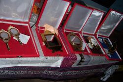 They are significantly inferior to modern mirrors in terms of the quality of the reflection, but in older societies were sufficiently impressive to have religious significance in some societies. Examples include the melong in Tibetan Buddhism and the toli in Asian Shamanism. The ancient Greeks and others used mirrors for divining,[3] and the Chinese believed they stored sunlight, and so could "guide the deceased through the underworld", making them essential grave-goods.[4]
