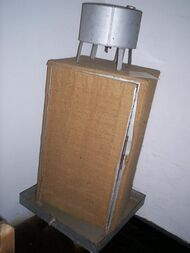 The Coolgardie safe was made of wire mesh, hessian, a wooden frame and had a hot dip galvanised iron tray on top. The galvanised iron tray was filled with water. The hessian bag was hung over the side with one of the ends in the tray to soak up the water.