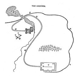 The tournament was held near Eglinton Castle, eight miles from the west coast of Scotland in Ayrshire, an imitation Gothic, an 18th-century Georgian mansion with battlements and turrets added.[40] The event took place on a meadow or holm at a loop in the Lugton Water. The ground chosen for the tournament was low, almost marshy, with grassy slopes rising on all sides.[41] The Knights on horseback and their retinue reached the tilt yard ('C' on the map) via an enclosed ride ('G' on the map), whilst the guests and visitors made their way to the stands via the route marked 'F' on the map illustrated. Both groups crossed over the three arched Gothic Eglinton Tournament Bridge. An 1837 map of Eglinton Castle, Grounds and Tilt yard shows that the tilt yard was already in existence at this early date, but it is not recorded what its fate was after the tournament was over.[42]