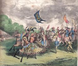 A great parade of knights was supposed to open the tournament at noon. The knights had had little practice mounting their horses and took a long time to get prepared. Then each knight and his entourage (forty different groups) was supposed to ride to the castle, pick up a lady, officer, or knight, and return to the lists. But there was only one drive to and from the castle, so that the knights had to jostle back and forth past and through each other. There had been no arrangement for parade control, and the knightly gridlock took hours longer to unfold than had been planned. Elaborate rehearsals and training in St John's Wood had not prepared participants for the crowded and already sodden conditions on the day. By the time the parade was ready, it was a half mile long and over three hours late.[43]
