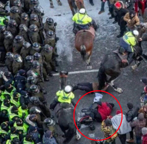 Canadian Liberal fascists ordered police to quell the protests. Ottawa mounted police used horses to charge into a crowd of peaceful protesters. The regime attacked crowds with rubber bullets and tear gas,[95] smashing truckers' windows amid frigid winter temperatures. An elderly, disabled, First Nations woman, a Mohawk elder[96][97][98] later identified as Candice Sero,[99] was standing with her mobility walker as the mounted police charged over her. She was originally reported to have been trampled to death,[100] but was later reported to be alive and in hospital with a dislocated shoulder.[101] Her words she spoke before she was trampled were recorded on video just before the assault by forces loyal to the liberal fascist regime: "Peace, love, and happiness. Peace. We are peaceful."[102] Social media exploded with calls for the UN to investigate Trudeau's human rights abuses.[103] Rebel News reporter Alexa Lavoie was viciously assaulted and injured by OPS jackboots, one of whom lunged at her and struck her in the head three times without provocation, followed by a second jackboot shooting a tear gas canister at her leg at point-blank range, all of which was caught live on camera as she was covering the OPS' continuing Trudeau-ordered Gestapo tactics against Freedom Convoy protesters.[104] Several of the protesters rescued Lavoie from being further attacked by the uniformed thugs. Rebel News host Ezra Levant, who speculated that Trudeau has officially ordered his jackboots to attack journalists who film their criminal activity and pointed out that some of them intentionally attacked Lavoie after they saw her filming them assaulting protesters, announced that the news outlet will sue the OPS for its criminal assault against Lavoie. Police received so many complaints about police misconduct that they sent out a tweet asking the public to stop calling emergency numbers.[105]