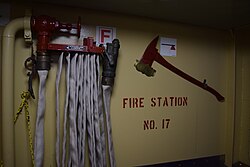 - Crash axe: A short lightweight handheld emergency chopping tool with a sharp or serrated blade spanning a quarter circular from the axis of the handle, sometimes with a notch in the blade to catch on sheet metal, and often a short pick opposite the blade, this tool or a prybar is required to be carried in most large aircraft cockpits with 20 seats or more to quickly chop and pry walls and cabinets to gain access when extinguishing a fire while in flight or to escape when exits are unavailable. A crash axe is sometimes also used by crash rescue firefighter crews to chop through the airplane's sheet metal skin for a rescue opening; modern crash axes are often made with an electrically insulated handle.[15][16]