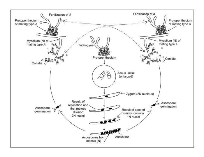After formation of the ascus-initial cell, the A and a nuclei fuse with each other to form a diploid nucleus (see Figure). This nucleus is the only diploid nucleus in the entire life cycle of N. crassa. The diploid nucleus has 14 chromosomes formed from the two fused haploid nuclei that had 7 chromosomes each. Formation of the diploid nucleus is immediately followed by meiosis. The two sequential divisions of meiosis lead to four haploid nuclei, two of the A mating type and two of the a mating type. One further mitotic division leads to four A and four a nucleus in each ascus. Meiosis is an essential part of the life cycle of all sexually reproducing organisms, and in its main features, meiosis in N. crassa seems typical of meiosis generally.