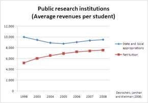 Tuition is charged at different rates from one type of institution to the next. Net tuition indices mark an increase in the "relative real burden" for payments at various types of institutions for higher education; in the period between 1980 and 1995; example, this burden increased by approximately 80 percent for students at public universities and by 148 percent for students at private universities.[9] More than half of public research universities charge students differential tuition based primarily on their major and their year in college, increasing normal tuition by up to 40 percent.[10]
