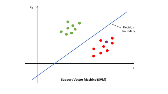 In the Support Vector Machine (SVM), the decision boundary was determined during the training process by the training dataset as represented by the green and red dots. The data of purple falls below the decision boundary, therefore it belongs to the red class.[7]