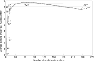 The curve of binding energy is characterized by a broad maximum near mass number 60 at 8.6 MeV, then gradually decreases to 7.6 MeV at the highest mass numbers. Mass numbers higher than 238 are rare. At the lighter end of the scale, peaks are noted for helium-4, and the multiples such as beryllium-8, Carbon-12, oxygen-16, neon-20 and magnesium-24. Binding energy due to the nuclear force approaches a constant value for large A, while the Coulomb acts over a larger distance so that electrical potential energy per proton grows as Z increases. Fission energy is released when a A larger than 120 nucleus fragments. Fusion energy is released when lighter nuclei combine.[9]