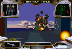 Later missions involve players completing more complex objectives such as fighting against enemy Iron Soldier units or escorting allied vehicles while protecting them from enemy fire. At the beginning, the player only has access to an assault rifle but players can expand their arsenal with a wide variety of weapons like rocket launchers, gatling guns, cruise missiles, among others which can be equipped on any part of the robot.[1] If the robot gets destroyed by enemy fire, the current mission will be left incomplete and players only have a limited number of continues before the game is over, though players have the option of resuming progress by loading their saved game into the last mission set or last mission reached, but the number of continues used is kept.[1] At the title screen, players can enter to the options menu and change various settings.[1]