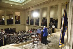 Yellen attended the local Fort Hamilton High School, where she was an honor society member and participated in the booster club, the psychology club, and the history club.[8] She also served as editor-in-chief of The Pilot, the school newspaper, which continued its 13-year streak as the first-place winner of the prestigious Columbia Scholastic Press Association contest under her leadership.[10] She earned a National Merit commendation letter and was admitted to a selective science honors program at Columbia University to voluntarily study mathematics on Saturday mornings. Yellen was one of 30 students to win state Regents scholarships for college and one of a select few to win the mayor's citation for a scholarship.[10] She graduated in 1963 as the valedictorian of her class. In line with school tradition, for the editor to interview the valedictorian, she interviewed herself in the third person.[11][8][10]