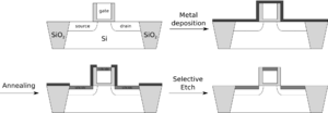 The salicide process begins with deposition of a thin transition metal layer over fully formed and patterned semiconductor devices (e.g. transistors). The wafer is heated, allowing the transition metal to react with exposed silicon in the active regions of the semiconductor device (e.g., source, drain, gate) forming a low-resistance transition metal silicide. The transition metal does not react with the silicon dioxide nor the silicon nitride insulators present on the wafer. Following the reaction, any remaining transition metal is removed by chemical etching, leaving silicide contacts in only the active regions of the device. A fully integrable manufacturing process may be more complex, involving additional anneals, surface treatments, or etch processes.