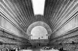 In the 1780s, Boullee, concentrating on his work as a teacher, scholar, and theoretician, wrote a treatise on his theories of art and architecture, illustrated with plans for public projects. The document was not published until 1953.[2] Boullée sought to create architectural forms suggesting the sublimity, immensity, and awesomeness of the natural world, as well as the divine intelligence underlying its creation. He was also influenced by the contemporary enthusiasm for antiquity, especially for Egyptian monuments, prevalent in Europe at that time. Boullée abstracted the geometric forms suggested by ancient works of architecture into a new concept of monumental building that combined the calm, ideal beauty of classical architecture with considerable expressive power. In his famous essay, La Théorie des corps, Boullée investigated the properties of geometric forms and their effect on the senses, attributing “innate” symbolic qualities to the cube, pyramid, cylinder, and sphere, the last of which he regarded as an ideal form. To bring geometric forms to life, Boullée used striking and original effects of light and shadow. He also emphasized the potential for mystery in building, often burying part of a structure. His “poetic” approach to architecture made extensive use of symbolism. For example, his Palais Municipal rests on four pedestal-like guardhouses, to symbolize that society is supported by law.