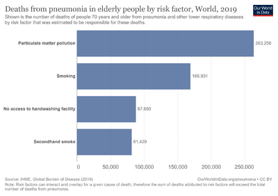Exposure to particulates of any size and composition may occur acutely over a short duration, or chronically over a long duration.[31] Particulate exposure has been associated with adverse respiratory symptoms ranging from irritation of the airways, aggravated asthma, coughing, and difficulty breathing from acute exposure to symptoms such as irregular heartbeat, lung cancer, kidney disease, chronic bronchitis, and premature death in individuals who suffer from pre-existing cardiovascular or lung diseases due to chronic exposure.[29] The severity of health effects generally depends upon the size of the particles as well as the health status of the individual exposed; older adults, children, pregnant women, and immunocompromised populations are at the greatest risk for adverse health outcomes.[32] Short-term exposure to particulate pollution has been linked to adverse health impacts.[33][34]