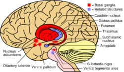 The dorsolateral striatum is associated with the acquisition of habits and is the main neuronal cell nucleus linked to procedural memory. Connecting excitatory afferent nerve fibers help in the regulation of activity in the basal ganglia circuit. Essentially, two parallel information processing pathways diverge from the striatum. Both acting in opposition to each other in the control of movement, they allow for association with other needed functional structures[48] One pathway is direct while the other is indirect and all pathways work together to allow for a functional neural feedback loop. Many looping circuits connect back at the striatum from other areas of the brain; including those from the emotion-center linked limbic cortex, the reward-center linked ventral striatum and other important motor regions related to movement.[49] The main looping circuit involved in the motor skill part of procedural memory is usually called the cortex-basal ganglia-thalamus-cortex loop.[50]