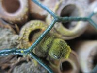 In most species, larvae are whitish grubs, roughly oval and bluntly-pointed at both ends. They have 15 segments and spiracles in each segment for breathing. They have no legs but move within the cell, helped by tubercles on their sides. They have short horns on the head, jaws for chewing food and an appendage on either side of the mouth tipped with a bristle. There is a gland under the mouth that secretes a viscous liquid which solidifies into the silk they use to produce a cocoon. The cocoon is semi-transparent and the pupa can be seen through it. Over the course of a few days, the larva undergoes metamorphosis into a winged adult. When ready to emerge, the adult splits its skin dorsally and climbs out of the exuviae and breaks out of the cell.[59]