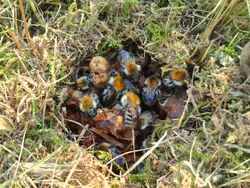 Many bumblebees are eusocial, similar to the eusocial Vespidae such as hornets in that the queen initiates a nest on her own rather than by swarming. Bumblebee colonies typically have from 50 to 200 bees at peak population, which occurs in mid to late summer. Nest architecture is simple, limited by the size of the pre-existing nest cavity, and colonies rarely last more than a year.[42] In 2011, the International Union for Conservation of Nature set up the Bumblebee Specialist Group to review the threat status of all bumblebee species worldwide using the IUCN Red List criteria.[43]
