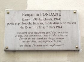 In the Western world (including the Romanian diaspora), there were a few authors whose work was influenced directly by Fondane's, among them Voronca[307] and David Gascoyne. Gascoyne, the author of "I.M. Benjamin Fondane" poem and recollection pieces on their friendship, spoke of the Romanian as a mentor, with a "decisive and lasting influence" on his own writings.[89] France is home to a Benjamin Fondane Studies Society, which organizes an annual workshop in Peyresq.[142][293][294] Since 1994, it publishes the academic review Cahiers Benjamin Fondane, which has recovered and published much of Fondane's correspondence[89][187] and political texts.[50] In 2006, following a Fondane Society request, a square on Paris' Rue Rollin was renamed in honor of the Romanian-born writer.[142][308] Three years later, on the 65th commemoration of Fondane's killing, the Mémorial de la Shoah museum hosted a special exhibit dedicated his life and literary work.[93][140][309] In Israel, a fragment from his L'Exode is engraved in English and Hebrew versions on the entrance of Yad Vashem memorial.[172]