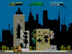 The player can climb any of the buildings, punching them to pieces and reducing them to rubble. Non-playable human characters within the levels can also be punched or grabbed and food items can be eaten. The player's monster receives damage from enemy bullets, sticks of dynamite, shells, punches from other monsters, and falls. Health is recovered by eating food items such as fruit, roast chicken, or soldiers. If a monster takes too much damage, it reverts into naked human form and starts walking off the screen sideways, covering its body with its hands. In this state, players can be eaten by another monster. If the player continues, the human mutates back into the monster or (if the human walked off the screen) flies in on a blimp (but has lost their score), with a full life bar.