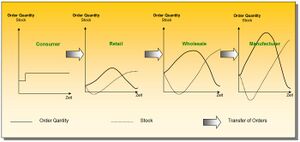 The bullwhip effect happens along the supply chain as the result of information asymmetry between the organisations involved.[16] The classic scenario is a sudden increase in customer demand as shown in the figure to the right. The sudden demand hike depletes the retailer's stock resulting in lost sales. To avoid this happen in the future, the retailer does not only increase its next order to the wholesaler by the additional customer demand observed in this period, but by a little bit more just to be safe. That is because the retailer knows it takes time for the wholesaler to deliver the larger order. This fear of losing out in future sales is the behavioral component of the inventory problem causing the bullwhip effect.[17] Faced with an unexpectedly larger order by the retailer, the wholesaler will forward an even larger order to the manufacturer. The manufacturer in turn makes a non-reversible decision to increase its production level even more in the nearer future. However, because of the delay in information flow from customers to manufactures, the latter is not aware for several order periods that its production level actually exceeds customer demand considerably. The result of the bullwhip effect in this classic application is an excessive amount of stock held by retailers, wholesalers and manufacturer. The more tiers a supply chain has, the larger the magnitude of the bullwhip effect becomes.[18]