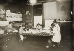 Home-based manufacturing operations were active year-round. Families willingly deployed their children in these income generating home enterprises.[43] In many cases, men worked from home. In France, over 58% of garment workers operated out of their homes; in Germany, the number of full-time home operations nearly doubled between 1882 and 1907; and in the United States, millions of families operated out of home seven days a week, year round to produce garments, shoes, artificial flowers, feathers, match boxes, toys, umbrellas and other products. Children aged 5–14 worked alongside the parents. Home-based operations and child labour in Australia, Britain, Austria and other parts of the world was common. Rural areas similarly saw families deploying their children in agriculture. In 1946, Frieda S. Miller – then Director of the United States Department of Labor – told the International Labour Organization (ILO) that these home-based operations offered "low wages, long hours, child labour, unhealthy and insanitary working conditions".[10][44][45][46]
