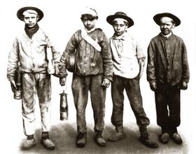 The Victorian era in particular became notorious for the conditions under which children were employed.[24] Children as young as four were employed in production factories and mines working long hours in dangerous, often fatal, working conditions.[25] In coal mines, children would crawl through tunnels too narrow and low for adults.[26] Children also worked as errand boys, crossing sweepers, shoe blacks, or selling matches, flowers and other cheap goods.[27] Some children undertook work as apprentices to respectable trades, such as building or as domestic servants (there were over 120,000 domestic servants in London in the mid-18th century). Working hours were long: builders worked 64 hours a week in the summer and 52 hours in winter, while servants worked 80-hour weeks.[28]