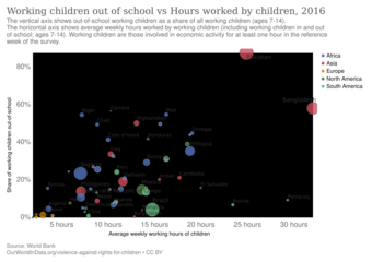 Work is undertaken from an early age by vast numbers of children in the world and may have a natural place in growing up.[223] Work can contribute to the well-being of children in a variety of ways;[224] children often choose to work to improve their lives, both in the short- and long-term. At the material level, children's work often contributes to producing food or earning income that benefits themselves and their families; and such income is especially important when the families are poor. Work can provide an escape from debilitating poverty, sometimes by allowing a young person to move away from an impoverished environment.[225] Young people often enjoy their work, especially paid work, or when work involves the company of peers. Even when work is intensive and enforced, children often find ways to combine their work with play.[226]
