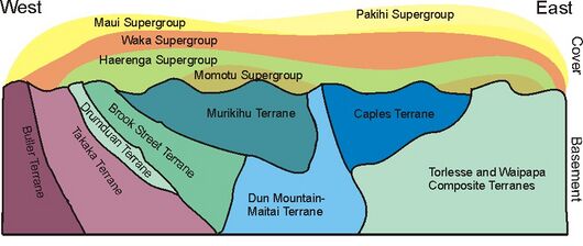 New Zealand stratigraphy has also informally been divided into two 'megasequences'.[1] The Austral Superprovince (Cambrian-Cretaceous) includes all basement rocks and the Zealandia Megasequence (Cretaceous-Holocene) refers to those, younger rocks, that cover them. The Austral Superprovince is divided into the Eastern and Western Province, which have seven and two terranes respectively. The Zealandia Megasequence is divided into five supergroups, from oldest to youngest they are the Momotu, Haerenga, Waka, Māui and Pākihi supergroups.[1]