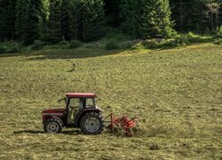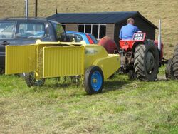 A tedder (also called hay tedder) is a machine used in haymaking. It is used after cutting and before windrowing, and uses moving forks to aerate or "wuffle" the hay and thus speed drying before baling or rolling. The use of a tedder allows the hay to dry ("cure") better, which prevents mildew or fermentation.[1]