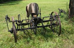 The original tedder is a farm tool on two wheels pulled by a horse; the rotation of the axle drives a gear which operates a "number of arms with wire tines or fingers at the lower ends."[9] The tines pick up the hay and disperse it; usually, the height at which the tines pick up the hay can be adjusted.