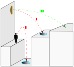 In Portal, the player controls the protagonist, Chell, from a first-person perspective as she is challenged to navigate through a series of test chambers using the Aperture Science Handheld Portal Device, or portal gun, under the supervision of the artificial intelligence GLaDOS. The portal gun can create two distinct portal ends, orange and blue. The portals create a visual and physical connection between two different locations in three-dimensional space. Neither end is specifically an entrance or exit; all objects that travel through one portal will exit through the other. An important aspect of the game's physics is momentum redirection and conservation.[4] As moving objects pass through portals, they come through the exit portal at the same direction that the exit portal is facing and with the same speed with which they passed through the entrance portal.[5] For example, a common maneuver is to place a portal some distance below the player on the floor, jump down through it, gaining speed in freefall, and emerge through the other portal on a wall, flying over a gap or another obstacle. This process of gaining speed and then redirecting that speed towards another area of a puzzle allows the player to launch objects or Chell over great distances both vertically and horizontally. This is referred to as 'flinging' by Valve.[4] As GLaDOS puts it, "In layman's terms: speedy thing goes in, speedy thing comes out." If portal ends are not on parallel planes, the character passing through is reoriented to be upright with respect to gravity after leaving a portal end.