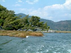Above the river's sheer cliffs are the weathered façades of Lycian tombs cut from rock, circa 400 BC ( [ ⚑ ] 36°50′1.09″N 28°38′3.16″E / 36.8336361°N 28.6342111°E). The ruins of the ancient trading city of Kaunos are a short boat trip across the river.[1]