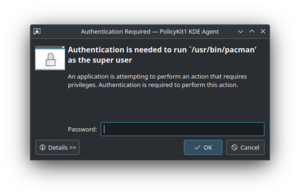 It is also possible to use polkit to execute commands with elevated privileges using the command pkexec followed by the command intended to be executed (with root permission).[7] However, it may be preferable to use sudo, as this command provides more flexibility and security, in addition to being easier to configure.[8]