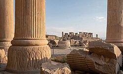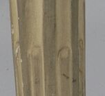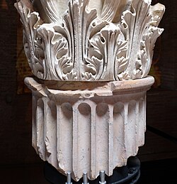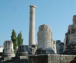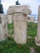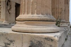 But the flutes of the top and bottom drums appear to have been started, to give a guide for the rest. A now isolated Ionic column at the Temple of Apollo, Didyma shows this; only part of the top drum has been fluted. Another unfinished Ionic drum section in the agora at Kos has been marked up for fluting, which never took place. In both of these examples there are rather wide margins outside the fluting to the roughly finished surface.[17] There has been considerable modern exploration of the mathematical techniques used to create models of templates for fluting. The practical problems for the masons were increased by the variable girth of the shafts, which both tapered overall and had the entasis swelling in the middle.[18]