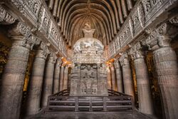 Sections of column shafts with relatively shallow vertical concave fluting were used in India, especially in early rock-cut architecture, as at the Buddhist Ajanta Caves. They were typically mixed with horizontal bands of more complex ornament, such as garlands or floral scrolls. These were useful for covering what might be awkward transitions between different zones.[30] Spiral fluting is sometimes found in the same way, as inside Cave 26 at Ajanta, from the late 5th or early 6th century.