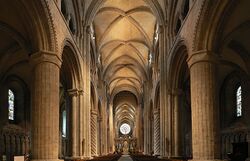Columns continued to be important in Romanesque and Gothic architecture, often engaged or clustered together in bunches. But the shafts are almost always plain. An exception is two of the large columns ("piers") in the nave of Durham Cathedral (c. 1120s). These have a distinctive format of alternating convex and concave flutes. These were carved on the stones before the pier was erected.[33]