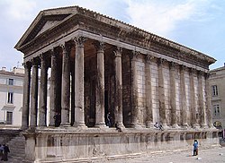 Fluted Corinthian columns perhaps became associated with imperial grandeur. Even rather small provincial caesariums, or temples of the Imperial cult have them on their porches, as do imperial triumphal arches. Examples of temples include the Maison carrée, the Roman Temple of Évora, and Temple of Augustus, Barcelona in provincial centres, as well as the much larger temples in Rome, such as the Temple of Vespasian and Titus. However the Temple of Augustus, Pula has plain Corinthian columns. Triumphal arches with fluting include the Arch of Augustus in Rimini, and the one in Susa, Arch of Trajan in Ancona, and all the imperial arches in Rome. Large temples with unfluted columns include the Temple of Saturn (Ionic, and a late rebuilding), the Temple of Venus and Rome, and others in the Roman Forum.