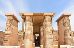 One of the earliest remaining examples of fluting in limestone columns can be seen at Djoser's necropolis in Saqqara, built by Imhotep in the 27th century BC. The Temple of Luxor, mostly about 1400 BC, has different types in different areas. In some types only part of the shaft is fluted; some columns at Luxor have five different zones of vertical fluting or horizontal banding.