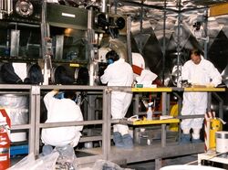The NASA Space Radiation Laboratory makes use of a particle accelerator that produces beams of protons or heavy ions. These ions are typical of those accelerated in cosmic sources and by the Sun. The beams of ions move through a 100 m (328-foot) transport tunnel to the 37 m2 (400-square-foot) shielded target hall. There, they hit the target, which may be a biological sample or shielding material.[26] In a 2002 NASA study, it was determined that materials that have high hydrogen contents, such as polyethylene, can reduce primary and secondary radiation to a greater extent than metals, such as aluminum.[27] The problem with this "passive shielding" method is that radiation interactions in the material generate secondary radiation.