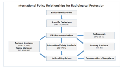 The ICRP's recommendations flow down to national and regional regulators, which have the opportunity to incorporate them into their own law; this process is shown in the accompanying block diagram. In most countries a national regulatory authority works towards ensuring a secure radiation environment in society by setting dose limitation requirements that are generally based on the recommendations of the ICRP.