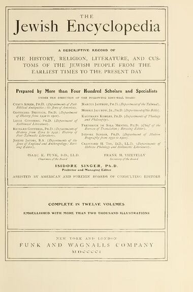 The encyclopedia's managing editor was Isidore Singer. The editorial board was chaired by Isaac K. Funk and Frank H. Vizetelly. The other editors participating in all twelve volumes were Cyrus Adler, Gotthard Deutsch, Richard Gottheil, Joseph Jacobs, Kaufmann Kohler, Herman Rosenthal, and Crawford Howell Toy. Morris Jastrow, Jr. and Frederick de Sola Mendes assisted with volumes I & II; Marcus Jastrow with volumes I, II, & III; Louis Ginzberg with the first four volumes; Solomon Schechter with volumes IV through VII; Emil G. Hirsch with volumes IV through XII; and Wilhelm Bacher with volumes VIII through XII. William Popper served as the assistant revision editor and chief of translation for Vols. IV through XII.