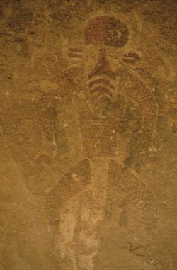 Following the Ogolian period, between the late 10th millennium BCE and the early 9th millennium BCE, the creators of the Ounjougou pottery – the earliest pottery in Africa – migrated, along with their pottery, from Ounjougou, Mali into the Central Sahara.[13] The emergence and expansion of ceramics in the Sahara may be linked with the origin of both the Round Head and Kel Essuf rock art, which occupy rockshelters in the same regions (e.g., Djado, Acacus, Tadrart) as well as have a common resemblance (e.g., traits, shapes).[16] Whether or not Ounjougou ceramic culture spread as far as Bir Kiseiba, Egypt, which had pottery that resembled Ounjougou pottery, had implements used for grinding like at Ounjougou, and was followed by subsequent ceramic cultures (e.g., Wadi el Akhdar, Sarurab, Nabta Playa), remains to be determined.[13] Between 8200 BCE and 6400 BCE, Central Saharan hunter-gatherers of Libya (e.g., Takarkori, Uan Afuda) gathered a diverse selection of flora (e.g., aquatic plants from lakes, grasses from savanna grasslands) and utilized ceramic pots to process and cook the flora.[58] By 10,000 BP, the primary region of residence for Niger-Congo speakers, who wielded bows and arrows, may have been the southern region of the Central Sahara.[14] Amid an early period of the Holocene, semi-settled Epipaleolithic and Mesolithic hunters, who created a refined material culture (e.g., stone tools, decorated pottery) as early as 10,000 BP,[59] also created the engraved Kel Essuf and painted Round Head rock art styles located in the region (e.g., some in the Acacus, some in the Tadrart, some in the Jebel Uweinat) of Libya, in the region (e.g., some in the Tadrart, most abundant in Tassili n'Ajjer) of Algeria, in the region (e.g., Djado) of Nigeria, and the region (e.g., Djado) of Niger.[59][60][61] Amid the early Sahara, Round Head rock artists, who had a sophisticated culture and engaged in the activity of hunting and gathering, also developed pottery, utilized vegetation, and managed animals.[62] The cultural importance of shepherded Barbary sheep (Ammotragus lervia) is shown via their presence in Round Head rock art throughout the Central Sahara (e.g., Libyan region of Tadrart Acacus, Algerian region of Tassili n’Ajjer).[63] Barbary sheep were corralled in stone enclosures near Uan Afuda cave.[63] From up to 9500 BP, this continued until the beginning of the Pastoral Neolithic in the Sahara.[63] Between 7500 BCE and 3500 BCE, amid the Green Sahara, undomesticated central Saharan flora were farmed, stored, and cooked, and domesticated animals (e.g., Barbary sheep) were milked and managed, by hunter-gatherers near the Takarkori rockshelter, which is representative of the broader Sahara; this continued until the beginning of the Pastoral Neolithic in the Sahara.[17]