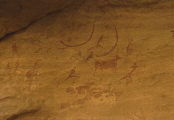 By at least the 4th millennium BCE, as indicated via the painted rock art of Tassili n’Ajjer, Proto-Fulani culture may have been present in the area of Tassili n’Ajjer.[90] The Agades cross, a fertility amulet worn by Fulani women, may be associated with the hexagon-shaped carnelian piece of jewelry depicted in the rock art at Tin Felki.[90] At Tin Tazarift, the depiction of a finger may allude to the hand of the mythic figure, Kikala, the first Fulani pastoralist.[90][91] At Uan Derbuaen rockshelter of eastern Tassili, composition six may depict a white ox, under the spell of serpent-related animals, crossing through a U-shaped gate of vegetation, toward a powerful benevolent figure, in order to undo the spell on the ox.[92] Composition six has been interpreted as portraying the Lotori ceremonial rite of Sub-Saharan West African Fulani herders.[92] The annual Lotori ceremonial rite, held by Fulani herders, occurs at a selected location and period of time,[93] and commemorates the ox and its origination in a source of water.[90][16] The Lotori ceremonial rite promotes good health (e.g., prevent epizooties, prevent illness, prevent sterility)[93][92] and reproductive success of cattle by having the cattle cross through a gate of vegetation, and thus, the continuity of the pastoral wealth of the nomadic pastoralist Fulani.[93] The interpretation of composition six as portraying the Lotori ceremonial rite, along with other forms of evidence, have been used to support the conclusion that modern Sub-Saharan West African Fulani herders are descended from peoples of the Sahara.[92]
