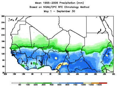 Amid the middle of the Holocene, West African hunter-gatherers continued to dwell along the rivers and within the forests of coastal West Africa.[8] West African hunter-gatherer stone industries had little presence to the north of the West Sudanian savanna and Sahel boundary, which may indicate that it served as a type of natural environmental barricade to their greatly mobile hunter-gatherer lifestyle.[8] Increased use of ceramics among West African hunter-gatherers also occurred, as evidenced by ceramics dated to 5370 ± 100 BP in Bosumpra Cave, Ghana and ceramics dated to 4180 ± 160 BP in Mbi Crater, Cameroon.[8] While likely still maintaining their hunter-gatherer culture, West African hunter-gatherers may have increasingly utilized local flora (e.g., palm oil, tubers).[8]