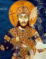 In 913, Simeon I of Bulgaria was crowned Emperor (Tsar, originally more fully Tsesar, cěsar') of his own people by the Patriarch of Constantinople and Imperial regent Nicholas Mystikos outside the Byzantine capital.[13] In its final expanded form, under the Second Bulgarian Empire the title read "Emperor and Autocrat of all Bulgarians and Greeks" (Цар и самодържец на всички българи и гърци, Car i samodăržec na vsički bălgari i gărci in the modern vernacular).[14] The Roman component in the Bulgarian imperial title indicated both rule over Greek speakers and the derivation of the imperial tradition from the Romans, however this component was never recognised by the Byzantine court.