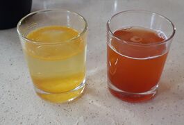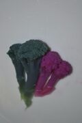 Purple cauliflower soaked in baking soda (left) and vinegar (right). Anthocyanin acts as an pH indicator.