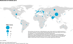 Climate change is predicted to have significant effects on global potato production.[88] Like many crops, potatoes are likely to be affected by changes in atmospheric carbon dioxide, temperature and precipitation, as well as interactions between these factors.[88] As well as affecting potatoes directly, climate change will also affect the distributions and populations of many potato diseases and pests. While potato is less important than maize, rice, wheat and soybeans, which are collectively responsible for around two-thirds of all calories consumed by humans (both directly and indirectly as animal feed),[89] it still is one of the world's most important food crops.[90] Altogether, one 2003 estimate suggests that future (2040–2069) worldwide potato yield would be 18-32% lower than it was at the time, driven by declines in hotter areas like Sub-Saharan Africa,[88] unless farmers and potato cultivars can adapt to the new environment.[91]
